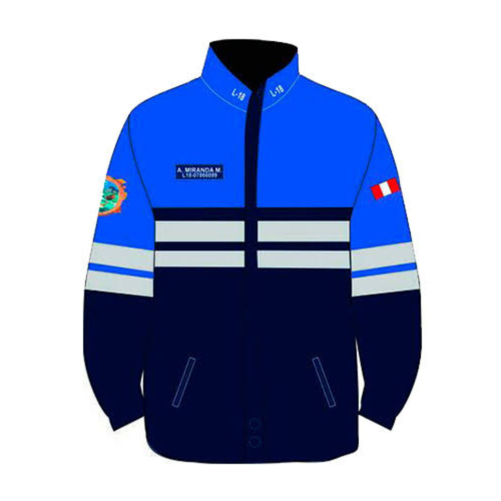 Casaca impermeable con cinta reflectiva, capucha, forro de polar y logos bordados